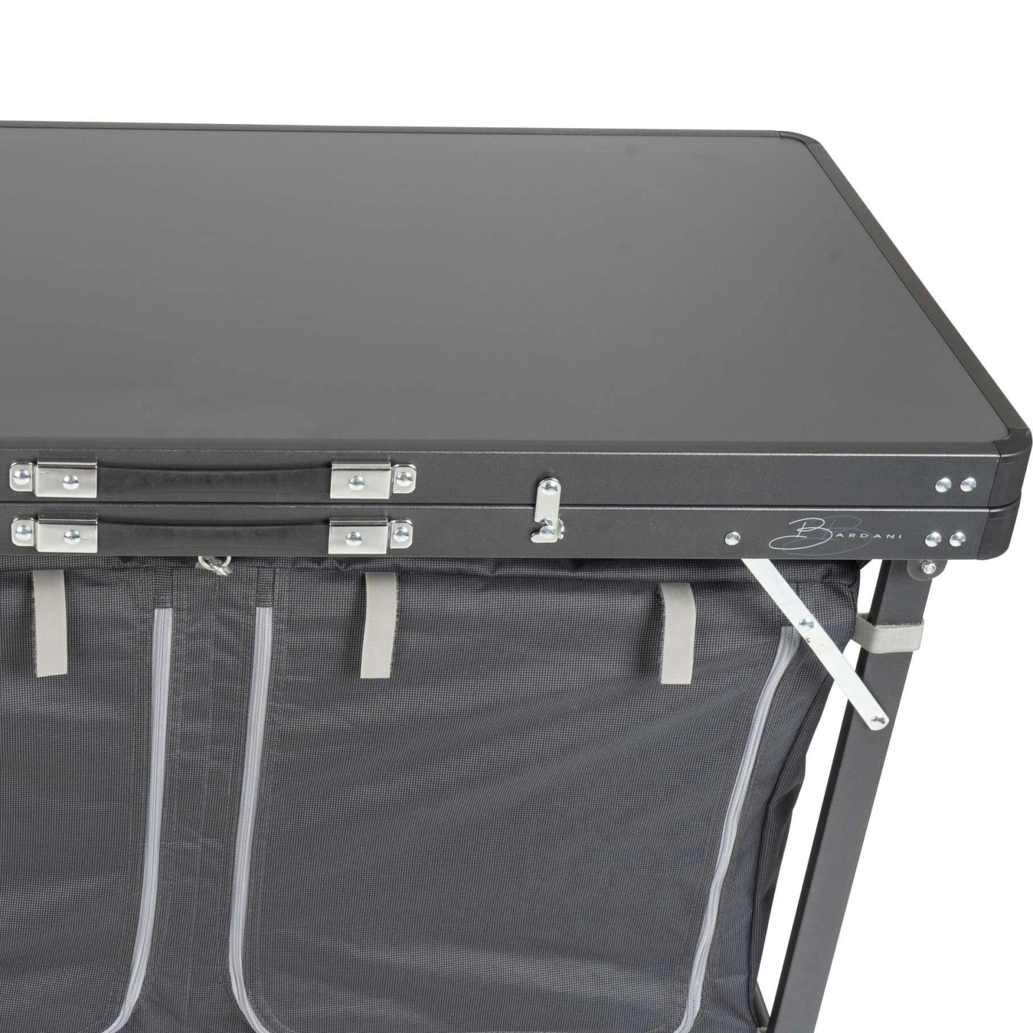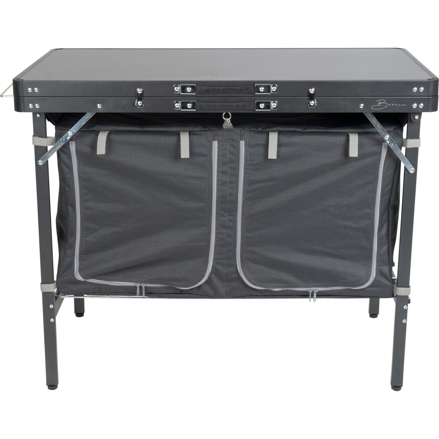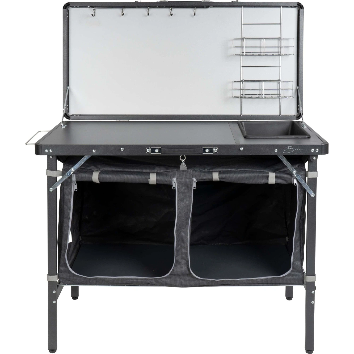 De Bardani Salamanca camping keuken is zeer geschikt voor kampeerders die graag koken op vakantie. Deze Bardani Salamanca camping keuken is voorzien van een aluminium frame, een 600 D polyester doek en een wasbakje. Dankzij de opbergrekjes, ophang haakjes en de schappen kunt u gemakkelijk uw kookspullen kwijt. De kampeerkeuken is ingeklapt helemaal plat.
