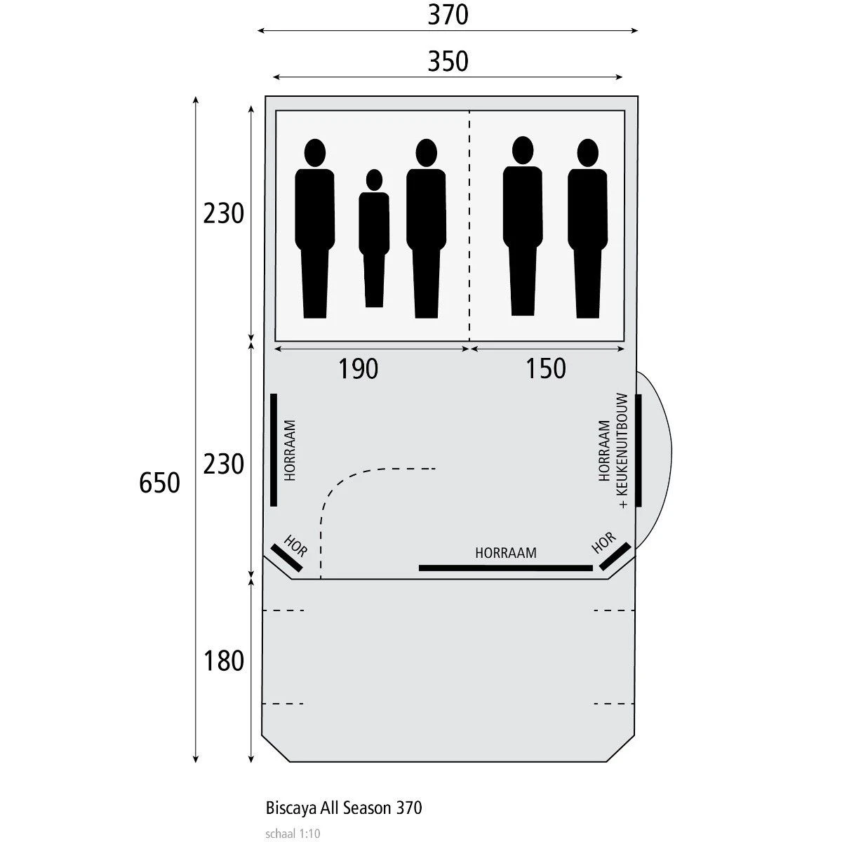 De tent is voorzien van grote pvc-ramen met horrengaas in het slaap- en leefgedeelte. De slaapcabines hebben een extra groot ventilatieraam in zowel de deur als de achterzijde. Op deze manier kunt u genieten van een prettig klimaat in de tent. Achterin de tent zijn inritsbare, extra donkere slaapcabines geplaatst met 2 compartimenten en oprolbare scheidingswanden. De slaapcabines zijn extra lang, namelijk 240 centimeter. Zo zijn de ruimtes ook geschikt voor grote opblaasbedden. De royale leefruimte is 230 cm breed en 370 cm lang en is voorzien van een verplaatsbare voorwand, te plaatsen in het leefgedeelte en de luifel maar is ook uitneembaar voor meer leef- of luifelruimte.
