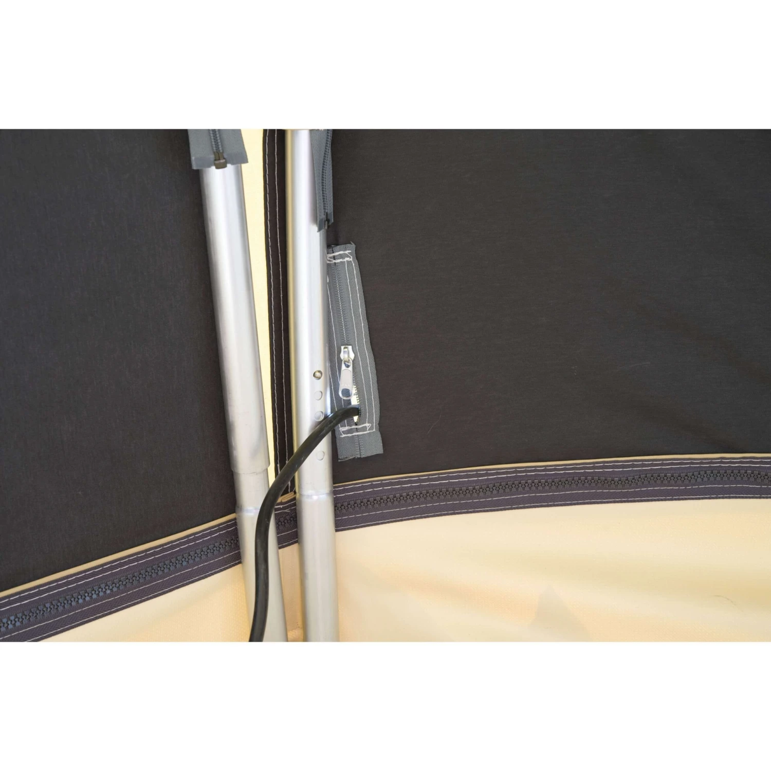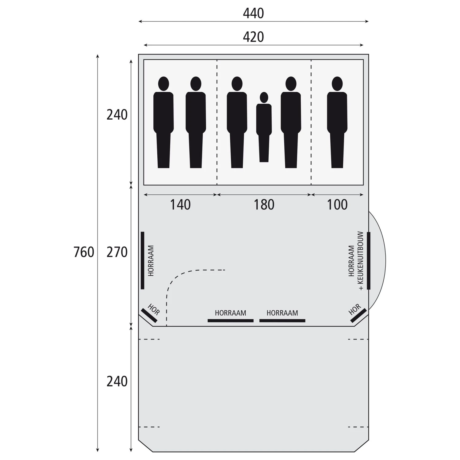 Achterin de tent zijn slaapcabines geplaatst met 3 compartimenten en oprolbare scheidingswanden met extra zware 10 mm ritsen. De slaapcabines zijn extra lang, namelijk 240 centimeter. Zo zijn de ruimste ook geschikt voor grote opblaasbedden. Aan de voorkant van de slaapcabine kan een organizer set worden bevestigd, dit is een apart product. De royale leefruimte is voorzien van grote pvc-ramen met horrengaas voor optimaal zicht en ventilatie. De gordijnen met een variabel verduistersysteem zijn de bedienen vanuit de leefruimte. De voorwand van de leefruimte is uitneembaar voor meer leef- of luifelruimte. De luifel heeft een voorwand die u apart kunt aanschaffen, om de leefruimte groter te maken of insectvrij buiten te zitten.