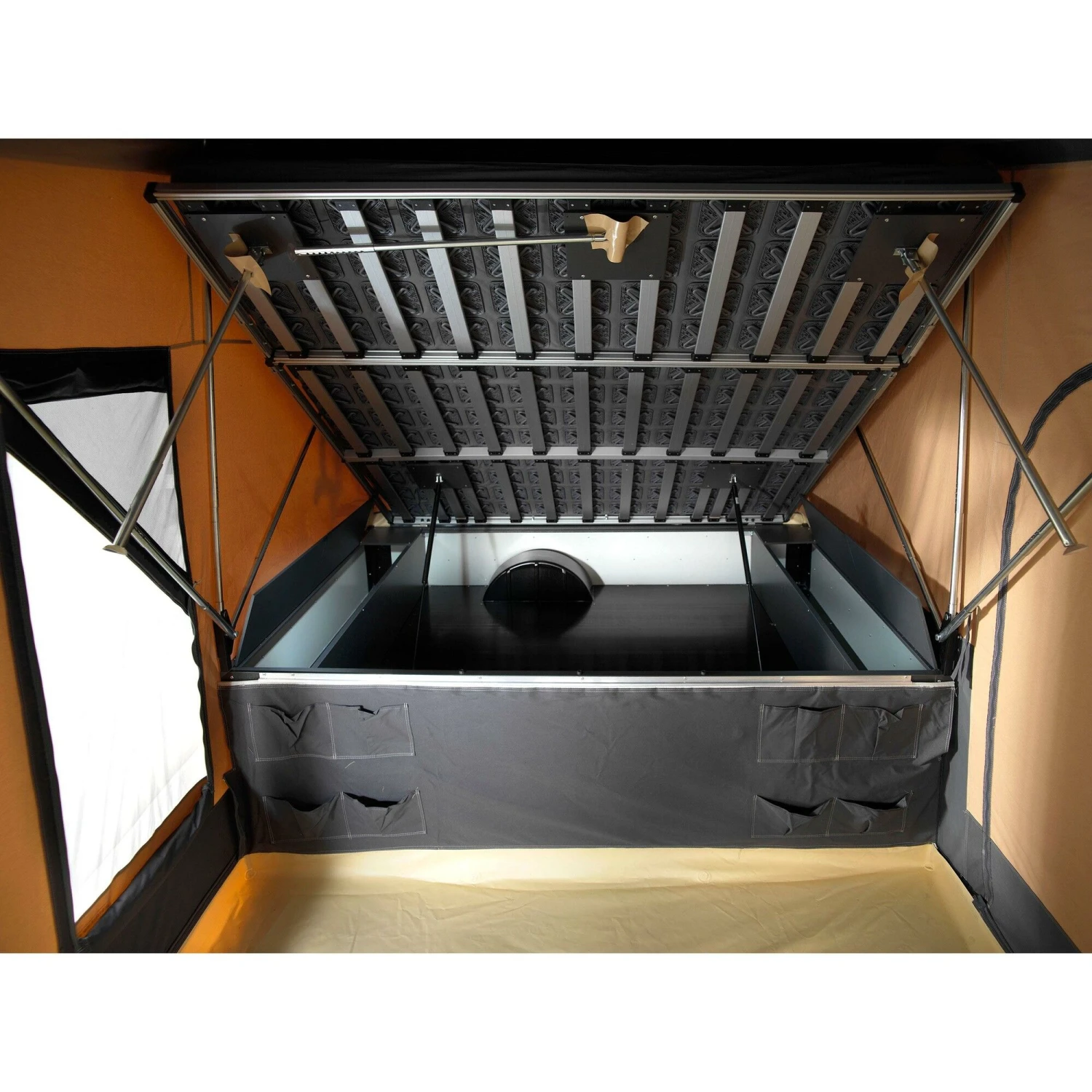 Het in- en uitpakken van de Malawi 2.0 Royale Basic vouwwagen wordt extra gemakkelijk gemaakt door het Easy Pack System. Dankzij dit systeem kunt u gemakkelijk de bagageruimte openen door het tentgedeelte omhoog te klappen. Als de vouwwagen is opgezet, kunt u een achtertent aan de wagen vastmaken voor extra opbergruimte of slaapruimte.