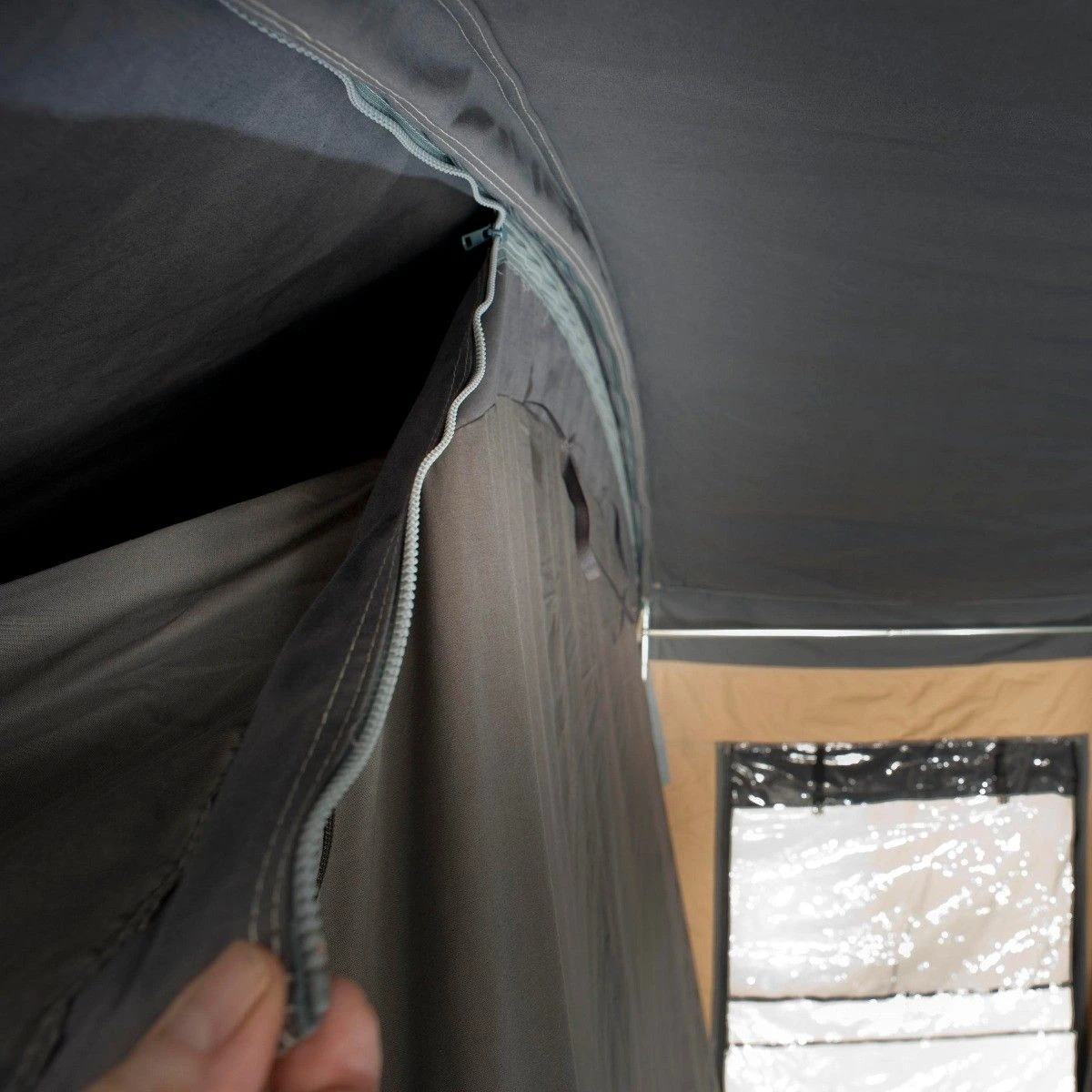 De voortent is voorzien van een bisonyl kuipgrondzeil. Dit in combintie met de tentdoeken zorgen ervoor dat het goed droog blijft in de tent. In zowel het slaapgedeelte en de voortent zijn voldoende ventilatiemogelijkheden om een aangenaam leefklimaat te creëren. Vanwege de grote ramen is er een mooie lichtinval. Deze ramen zijn gedeeltelijk van horrengaas waardoor er geen insecten in de tent komen.