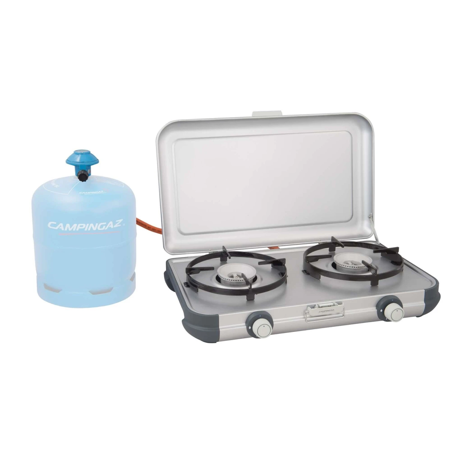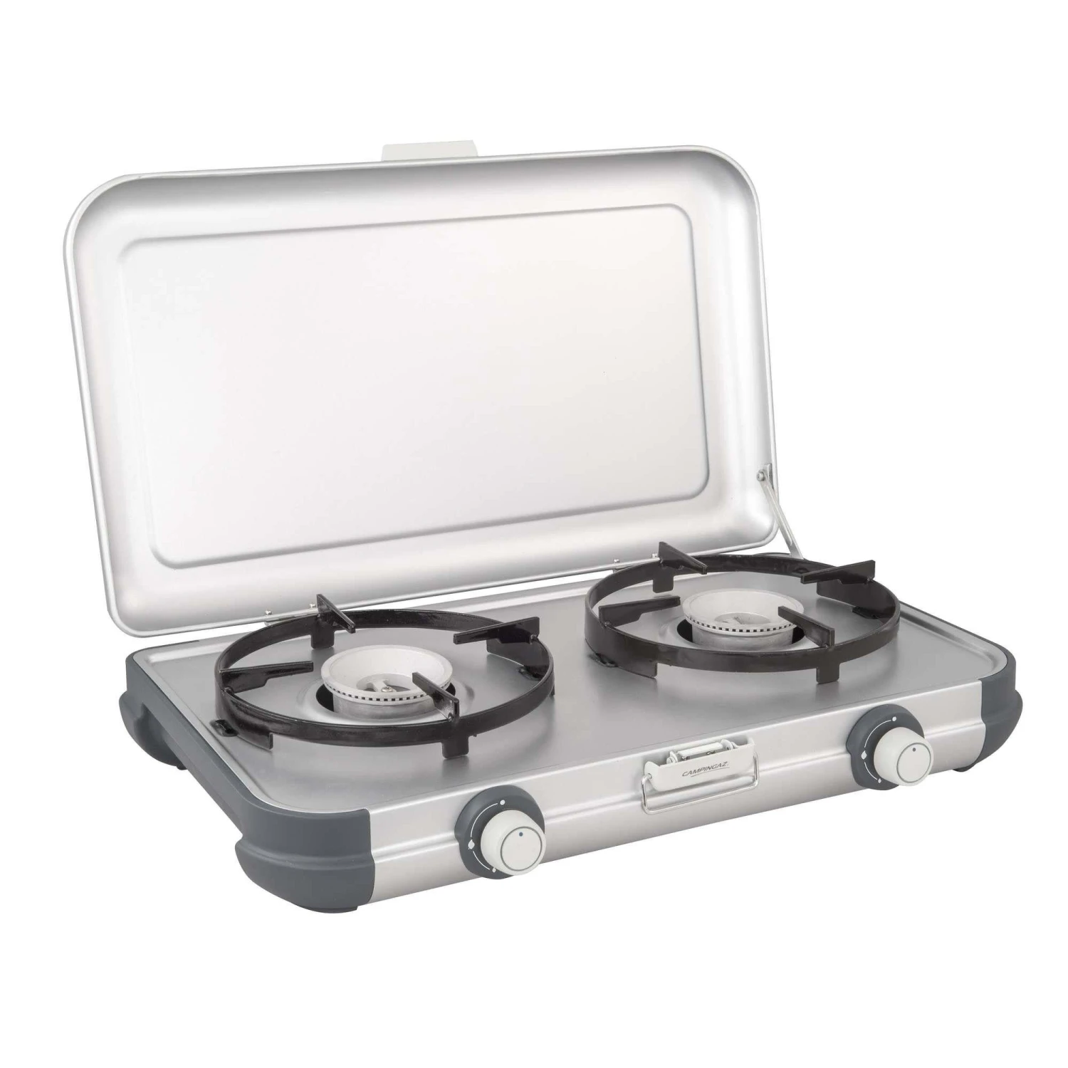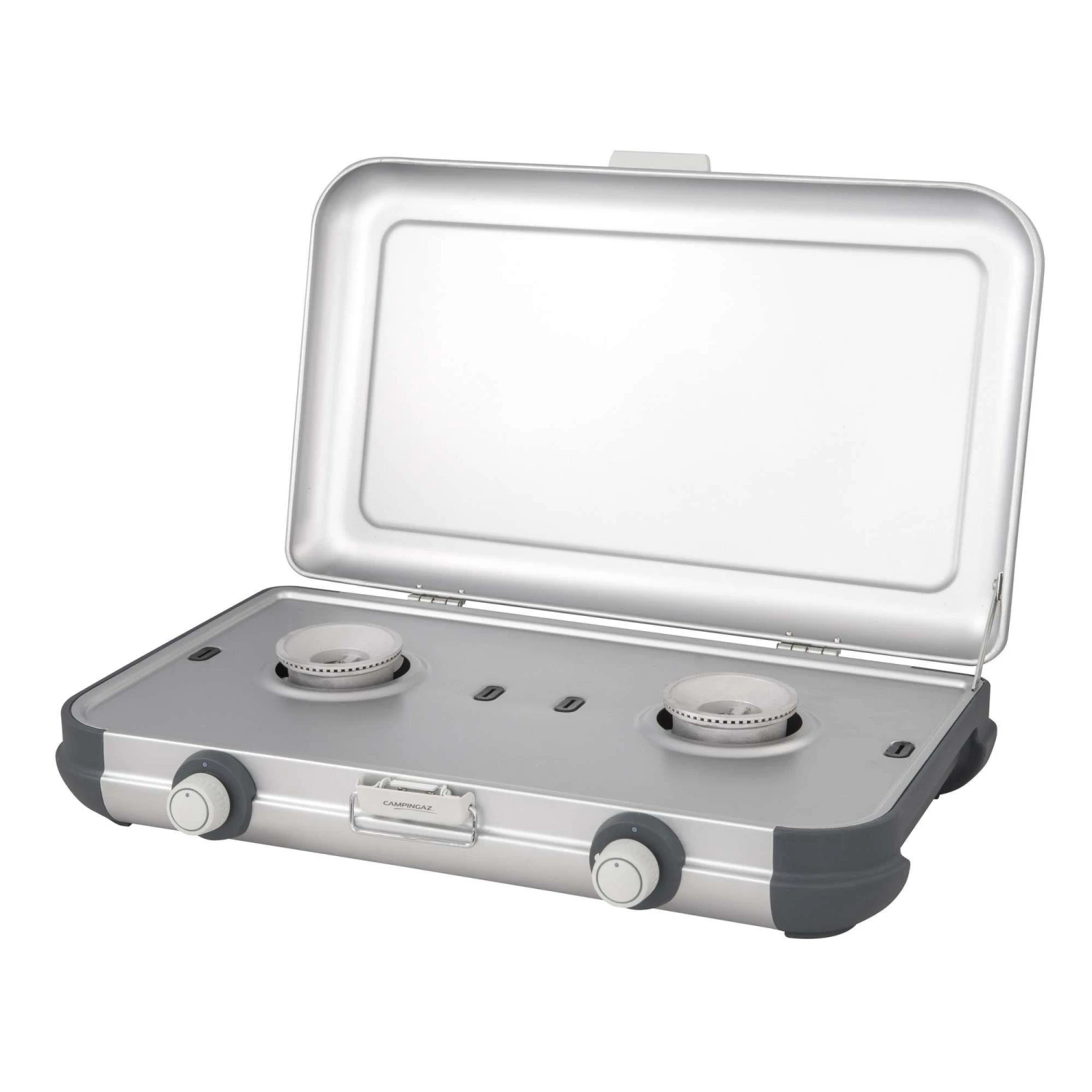 Het Campingaz Camping Kitchen 2 kooktoestel is een licht en draagbaar toestel met ingebouwd handvat en twee pitten. Het Campingaz kooktoestel is geschikt voor twee pannen met een diameter van 24 centimeter. De pansteunen van geëmailleerd staal zijn eenvoudig te verwijderen en schoon te maken, deze zijn namelijk vaatwasserbestedig. De zijpanelen zijn hittebestendig en bieden bescherming tegen de wind. De robuuste stalen deksel is voorzien van een veilig slot en de kookplaat heeft druk- en draaiknoppen voor volledige controle.