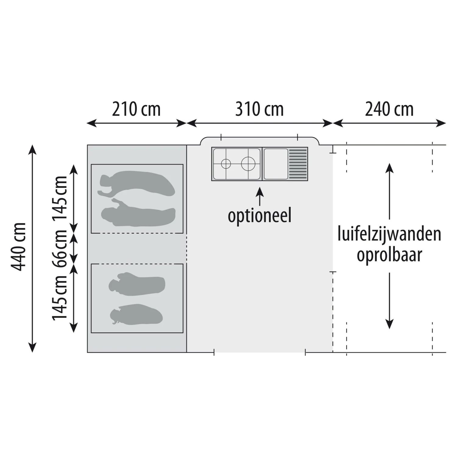 | Afmetingen voortent b x d in cm | 440 x 310 cm |