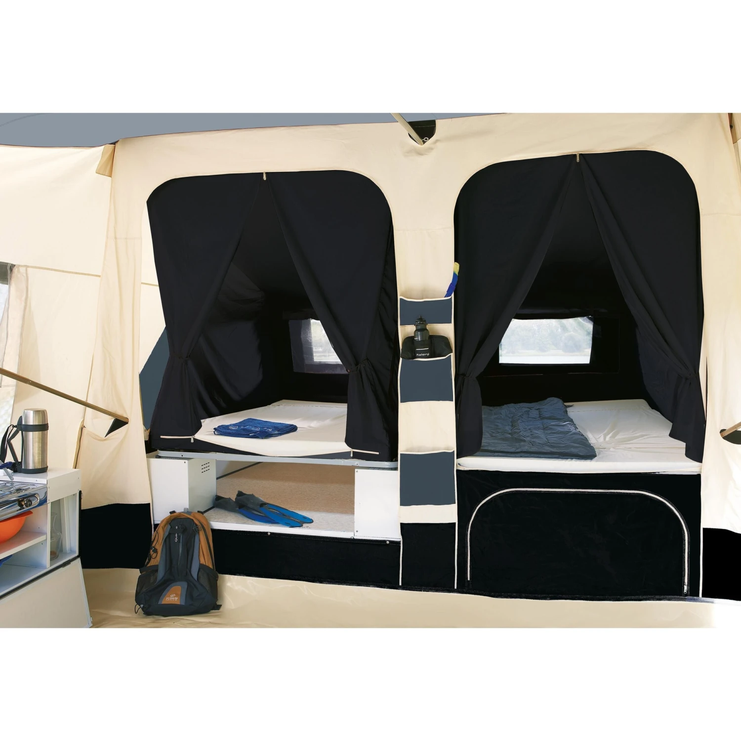 De Jametic Outdoor 2023 is voorzien van twee tweepersoons lattenbodem-bedden met extra stevig schuim, zodat er standaard al 4 personen heerlijk kunnen slapen. De slaapcabines bestaan uit donker doek voor optimaal slaapcomfort. Optioneel kan er een extra voortentuitbouw of ondertent geplaatst worden, zodat er voor maximaal 8 personen slaapruimte gecreëerd kan worden.