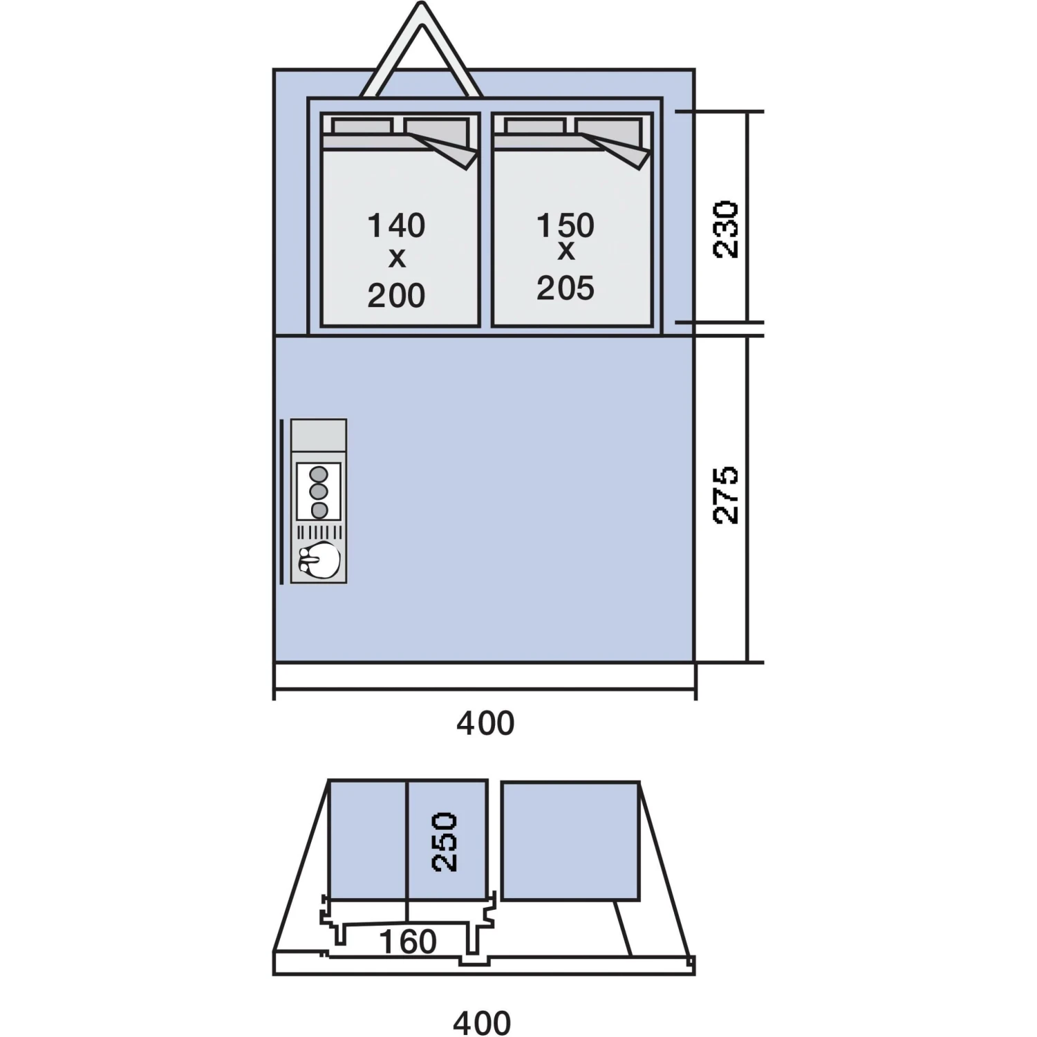 Dankzij dit handige systeem hoeft u de vouwwagen niet helemaal op te zetten voordat u de bagage kunt in- of uitladen. De beide bedden klappen compleet met het hele frame en de gehele tent open naar de zijkant, zonder dat het dekzeil of de achterkeuken eraf gehaald hoeven te worden. Het optillen is een fluitje van een cent dankzij de ondersteuning door middel van gasdrukveren.