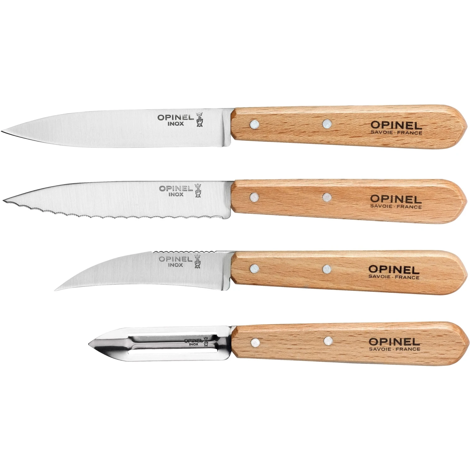 De Olivier keukenset 4-delig naturel is gemaakt van roestvrij staal en hout. De set bestaat uit de 4 meest gebruikte mesjes van Opinel. Namelijk een spits officemesje, gekarteld officemesje, tourneermesje en een dunschiller.